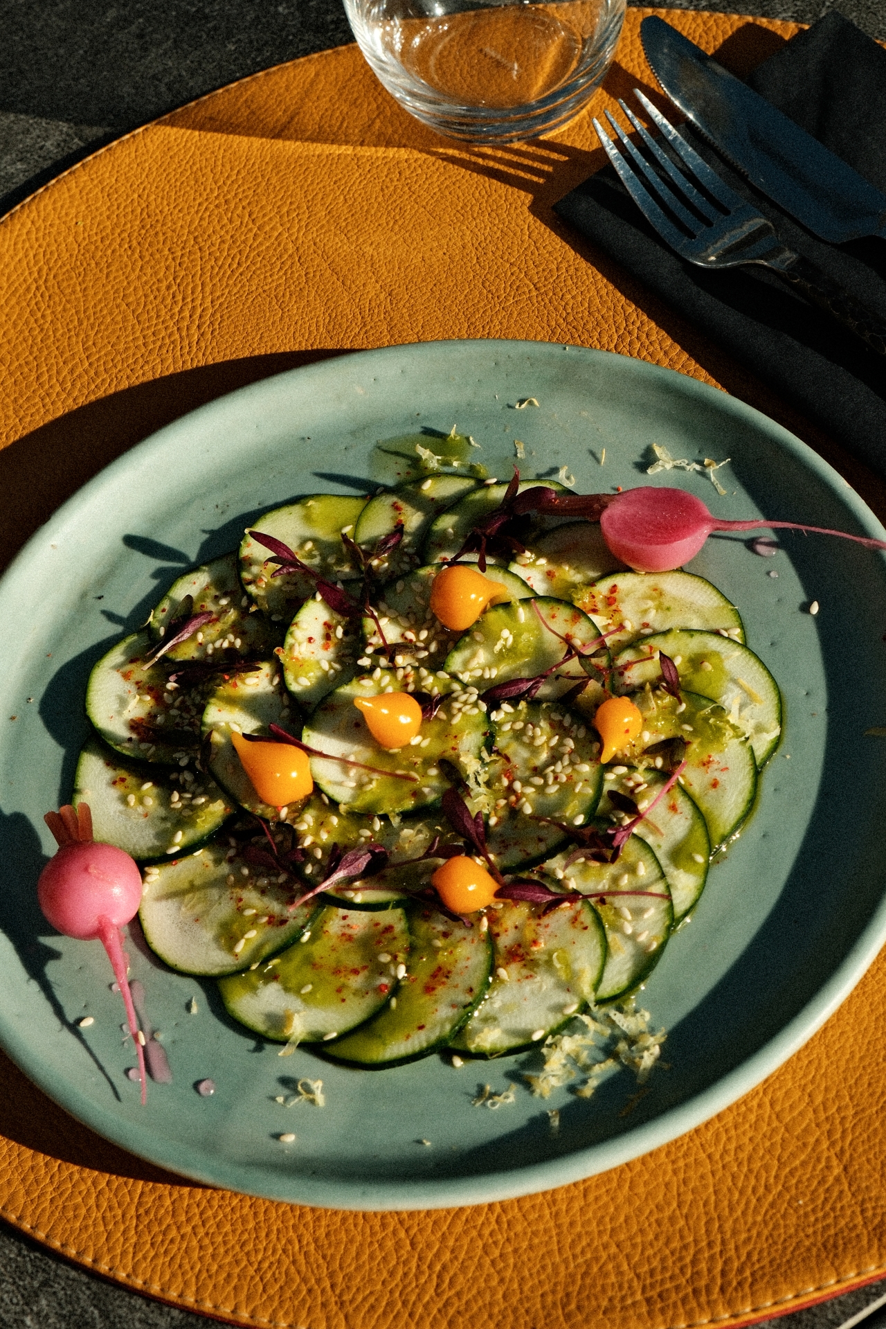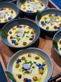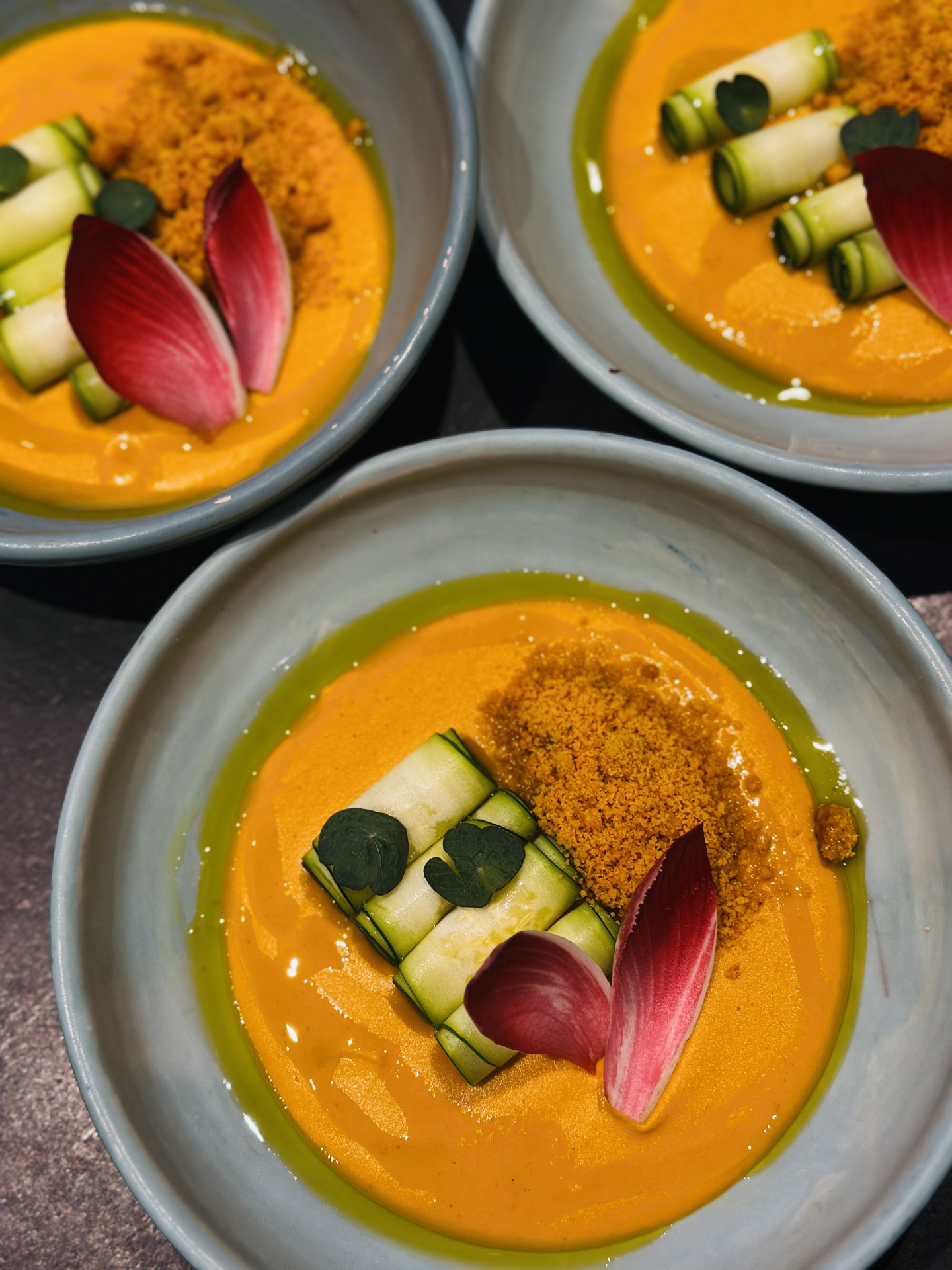 crème de lentilles corail et de sésame, huile verte, 8€